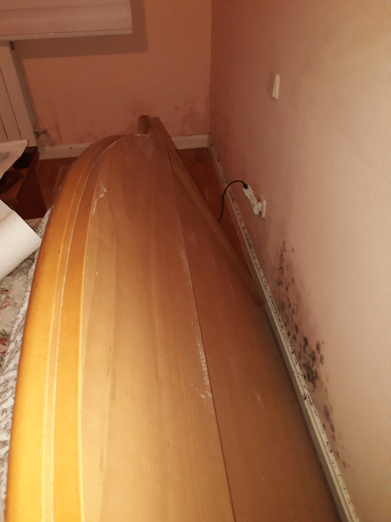 Doy también muchas gracias a Dios por tener un hogar, pues un hábitat agradable puede mitigar muchas dolencias, y con esa providencia de Dios contábamos para hacer frente a la nueva ola de hostilidad que se avecinaba. Pero, hete aquí, que llegados los primeros fríos del solsticio nos fue saboteada la instalación de calor; y hoy hace cuarenta días que estamos sin calefacción. Nueva corrida, nuevo tercio de banderillas… y empiezan los monosabios a marearnos con sus capotazos. El casero, el vecino, el calefactor de la comunidad, el portero, el pinche de Barroso, el buscafugas, el del seguro, otra vez cada uno de ellos, averías que surgen de un día para otro y se añaden a la original… Ayer nos dijeron que vendrían hoy a las nueve y media para localizar la fuga, pidiéndonos que activáramos el termostato una hora antes para que el circuito se llenara y el buscafugas fuera efectivo. Por precaución llamé a mi primo, ingeniero de minas, porque me parecía que tanto tiempo podría causar daños adicionales a los muros; y me aconsejó tomar una foto de la pared afectada antes de abrir el paso del agua, mostrando que su daño era mínimo y presentaba buen aspecto. Hoy, hacia las 8 y media, accioné el termostato e inmediatamente me fui con el móvil al cuarto de la fuga para hacer la foto: estaba la pared empapada y rebosante de moho el rodapié: Una mano negra y técnica había metido agua en nuestro circuito durante buena parte de la noche, tras cinco semanas inactivo. Semanas, por cierto, que hemos pasado calentándonos con dos pequeños calentadores de aceite y uno de aire, evitando estar donde no están ellos, y haciendo ejercicio a menudo pues saltan los plomos cada dos por tres. En la desarrollada época actual no te mandan a un gulag por protestar, sino que te traen el gulag a casa.