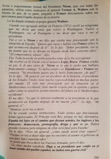Procede, con urgencia, recuperar el buen uso del lenguaje, que se está viciando a pasos agigantados y aproxima con celeridad la ceremonia del caos. Conviene llamar a las cosas por su nombre, abrir claros en la oscuridad reinante. Cuando Franco le dijo al General Walters, enviado por Nixon a preguntarle a Franco qué había pensado para después de su muerte, la contestación del caudillo fue la siguiente:
