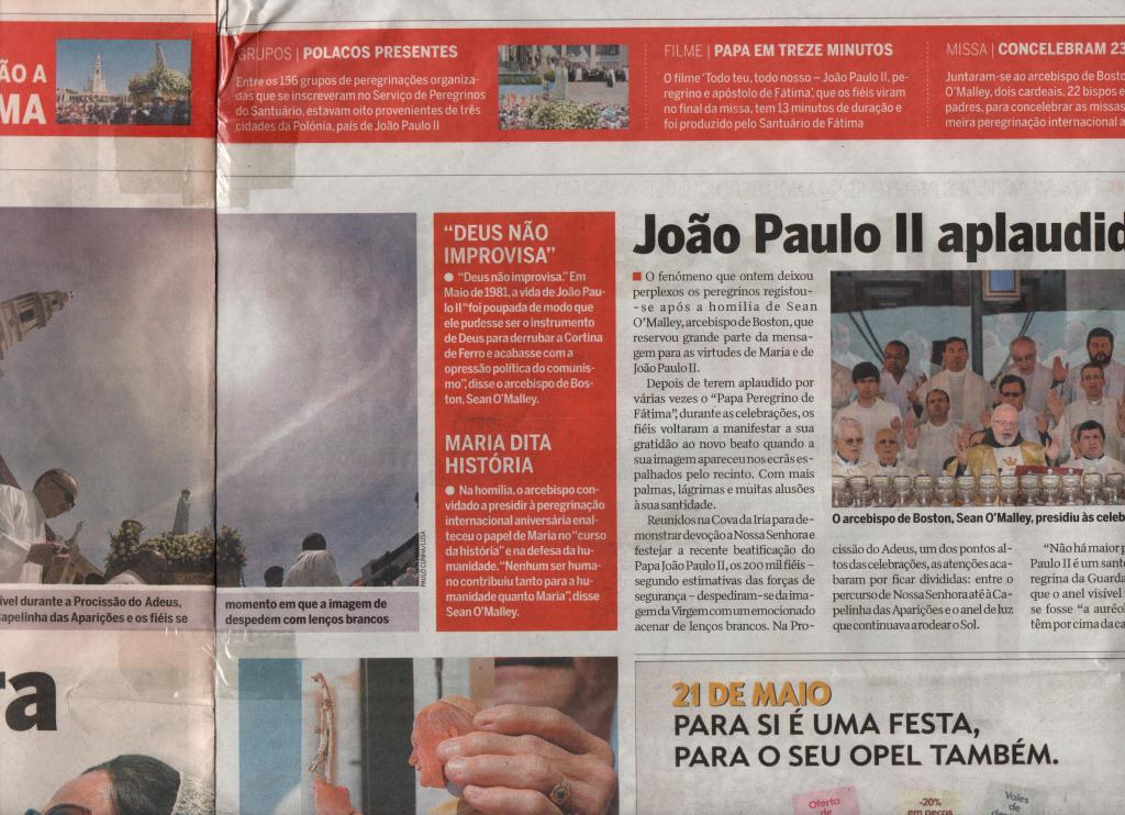 En la hemeroteca de la Biblioteca Nacional de Portugal está registrada la foto que encabeza este artículo, con el milagro que presenciamos en la explanada de Fátima varios miles de fieles el 13 de mayo de 2011, justo cuando se cumplían treinta años del infausto atentado contra la vida de San Juan Pablo II, que a la sazón llevaba treinta meses en el cargo. En aquella gracia especial -un fenómeno solar nunca antes visto, doy fe- el que hiciera recorrer por el mundo el «Totus Tuus, María», ya con ella, y por Ella, nos alentaba a perseverar en las virtudes.