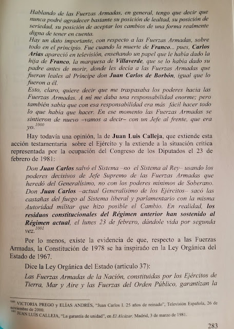 En el libro Aquí Hubo una Guerra, de Aguinaga, del 2011, cuya lectura recomiendo vivamente, hay una página, que pego a continuación, con unas reflexiones del periodista Juan Luis Calleja (nieto del otro Calleja, el que se hizo famoso por ‘sus cuentos’) en torno a lo sucedido el 23 F. De este episodio, por más que se diga, se ha divulgado una explicación sesgada y falta de veracidad, que deja al margen la verdad que nos podría ayudar a entender la actual situación de España (y una prueba de esto es que actualmente no se puede ver el vídeo del asalto al congreso tal cual fue, sin cortes -en uno de los más difundidos, de un minuto de duración, hay siete cortes de cámara, superposiciones y desacople de imagen y sonido).