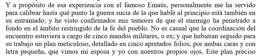 En ediciones anteriores ya habían pasado cosas que anticipaban este deterioro. Sucedió en una de las últimas que la torpeza de los organizadores dejó en evidencia una manipulación del debate que habitualmente seguía a la ponencia del obispo. En el contexto de crisis eclesial afloran casos como éste, en los que se adivina la presencia de los que, diciéndose cristianos, no lo son. Y muy frecuentemente son éstos los que introducen cambios en dinámicas bien consolidadas y fecundas para corromperlas. Y sucedió también este año, que, habiéndonos aislado del resto, vino el obispo a nuestro hotel a darnos una pequeña charla, actualizando la importancia de las apariciones de Fátima para el momento actual de la Iglesia. Hoy es tónica habitual en la vida de la Iglesia que, de una manera o de otra, se centren las discusiones en el tema de la mujer. Y a mí me asombra que no haya autoridad que diga claramente que ése es un camino sembrado de abrojos, que transcurre paralelo al que en el ámbito civil conduce a la destrucción de la familia y la sociedad, y tiene el mismo fin que éste. Según esto, en la edición de este año, el obispo nos estaba hablando del papel relevante de María, etc., y, llegado el delicado momento del debate, en que dos años atrás había quedado en evidencia el manejonteo de los falsos cristianos, otra vez sucedió que los nervios de éstos los delataron en sus firmes propósitos de silenciar las preguntas incómodas al prelado, al que procuran mantener en un limbo propicio a sus intereses. Ante esa nueva flagrante intromisión, señalé públicamente a los atrevidos impostores; y, cuál no sería mi sorpresa que, estando yo después comiendo solo (según la recomendación de San Pablo a los corintios), uno de aquellos vino a sentarse conmigo para darme un aviso (en esta batalla final, el mal usa técnicas militares -asunto que he documentado en relación al famoso Emaús, como apunto en el siguiente extracto de ‘alcielo’)
