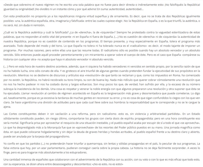 Es destacable en este artículo que llame estupradores a quienes promovían el engaño que llevaría al desastre; porque, en verdad, ejercían con su brutal propaganda una violación de un pueblo menor de edad -intelectual-, no violación carnal, pero sí más dañina que ésta en su efecto. La agudeza del análisis de Ortega no deja lugar a dudas, y la prueba es que, una vez acontecido el desastre, el propio Franco daría esa misma explicación acerca de las causas desencadenantes del conflicto civil; y así se desprende de sus palabras en la entrevista que le hizo Groussard, y que ya comentamos en su día.